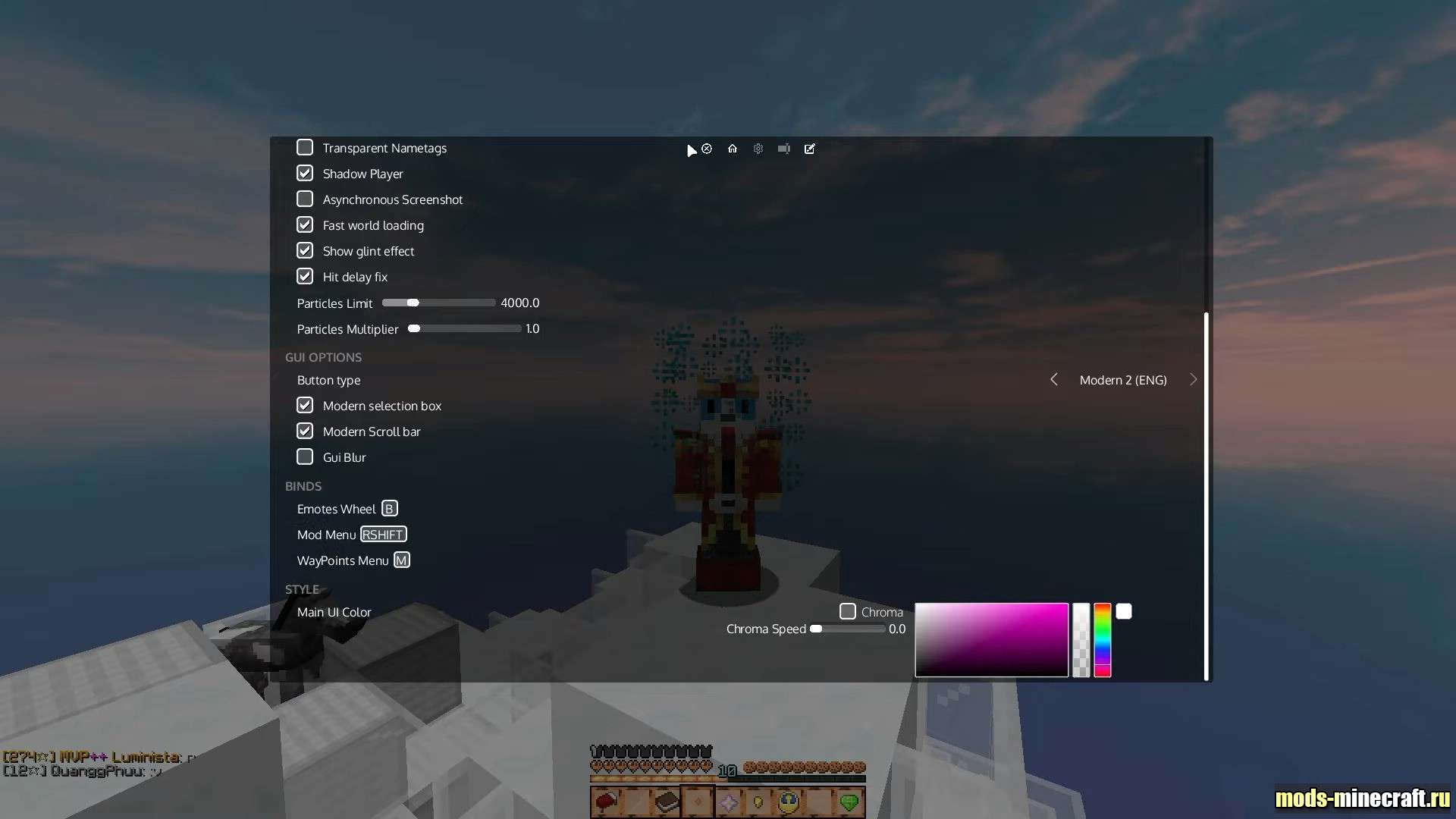 Общий комфорт ощущается и в интерфейсе клиента. Он переведён на несколько языков, переключение занимает секунду, это избавляет от необходимости постоянно сверяться со словарём и упрощает настройку модов.