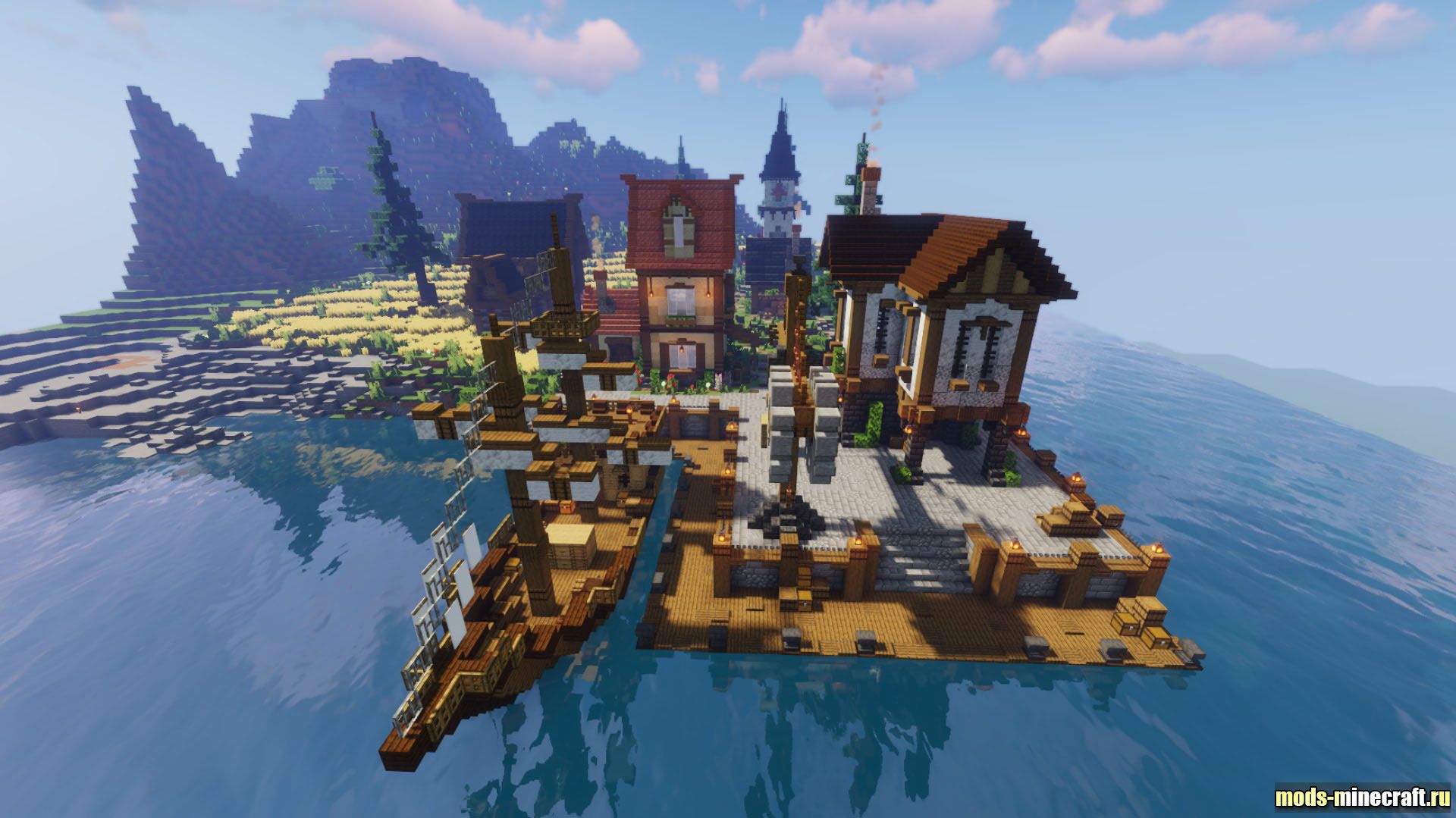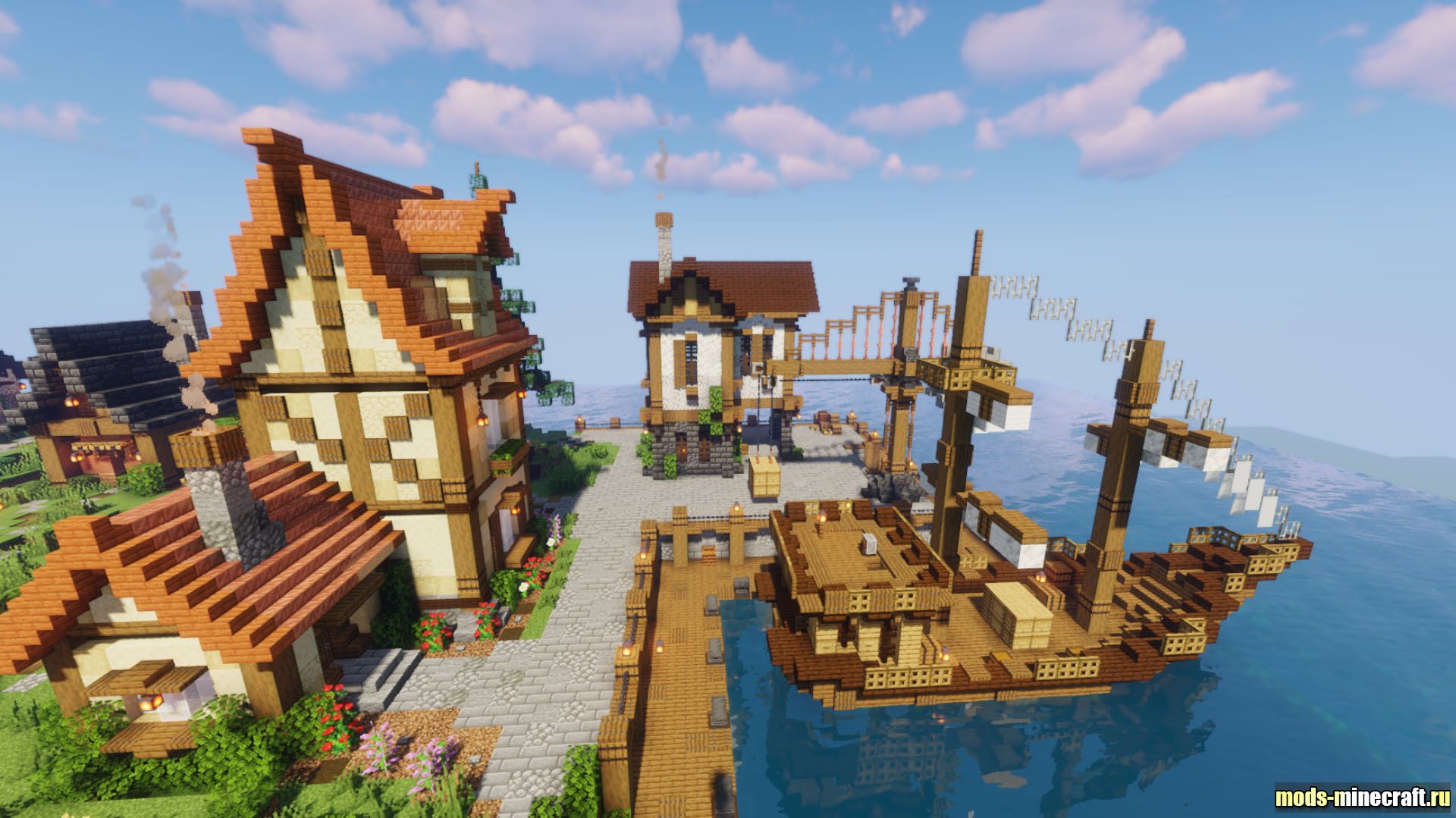 Medieval Seaside Village погружает в атмосферу уютного портового города, где жизнь течет спокойно у самой кромки воды. Прогулка по деревянному пирсу позволяет рассмотреть детали старого торгового судна, оно словно только что вернулось из плавания и замерло у причала. Здесь нет лишней суеты, только ощущение близости моря и продуманная планировка порта, она плавно переходит в жилые кварталы.