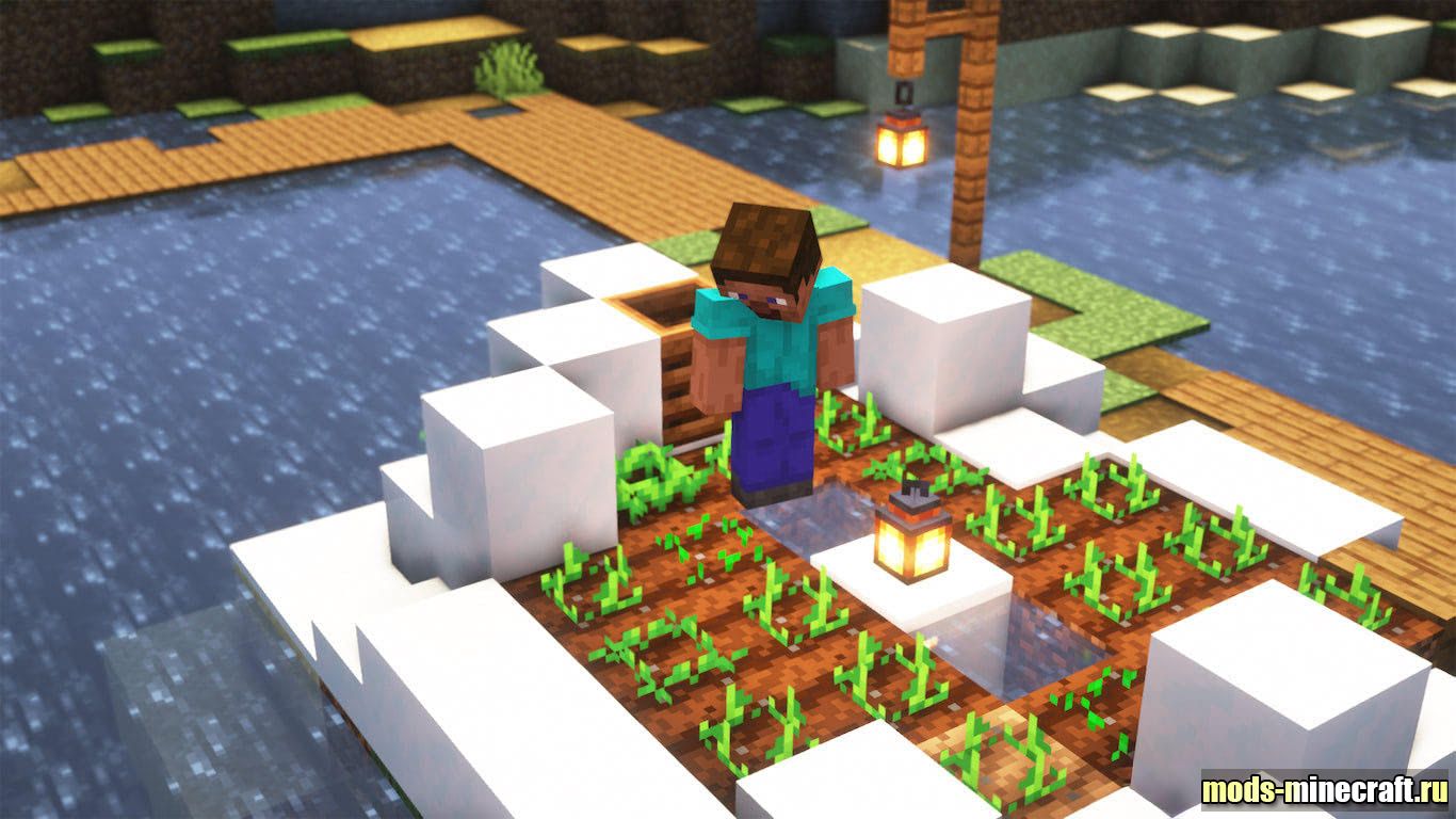С модом Survivality старт выживания каждый раз ощущается по-новому, ведь персонаж может появиться в абсолютно случайном биоме глубокой ночью или посреди грозы, а не только ясным утром на привычной поляне. Окружение реагирует на погоду, листва деревьев покрывается инеем во время снегопада, а лопатой теперь можно снимать снег аккуратными слоями вместо грубого разрушения целого блока. Такие мелочи делают игру логичнее, таблички редактируются прямо на месте без переустановки, а наковальня наконец-то перестает выдавать ошибку о слишком дорогом ремонте и позволяет чинить даже самое мощное снаряжение.