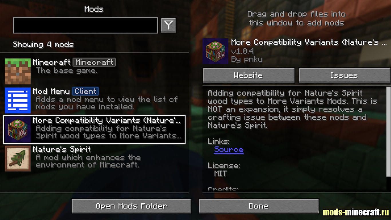 More Compatibility Variants решает эту проблему и связывает ресурсы между собой. Аддон помогает игре видеть доски из Nature’s Spirit как полноценный компонент для создания инструментов и декора. Теперь можно спокойно строить и крафтить любые предметы, не отвлекаясь на исправление ошибок в сборке.