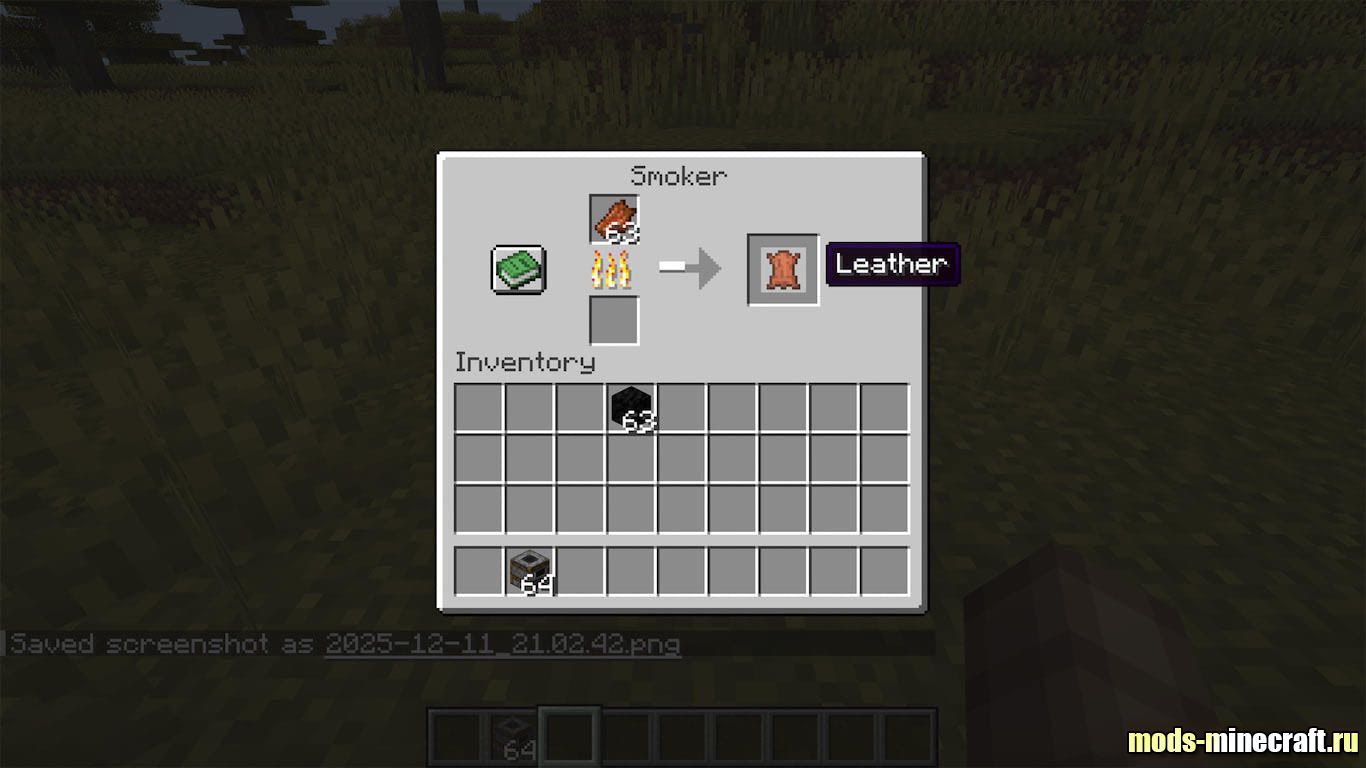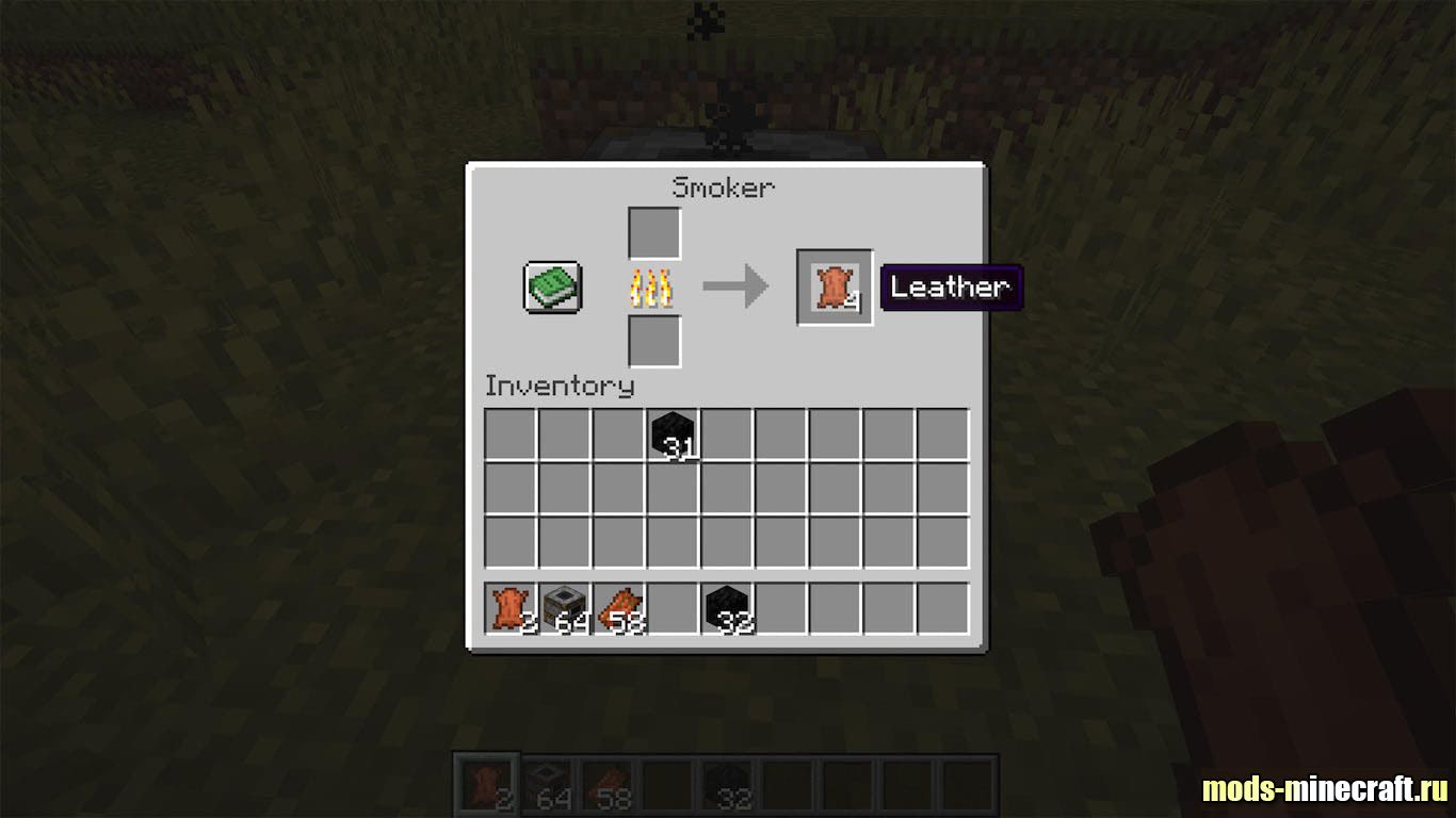 Гнилая плоть часто остается лежать мертвым грузом в инвентаре, но теперь ей нашлось применение в коптильне. Вы просто загружаете этот дроп с зомби в печь, ждете завершения процесса и забираете готовую кожу. Это позволяет не выбрасывать накопившиеся ресурсы, а пускать их в дело для создания рамок, книг или начальной брони.