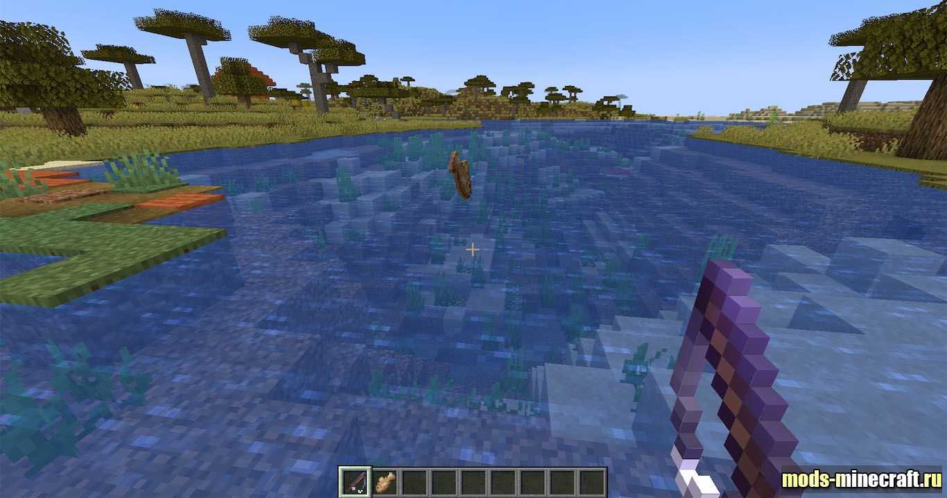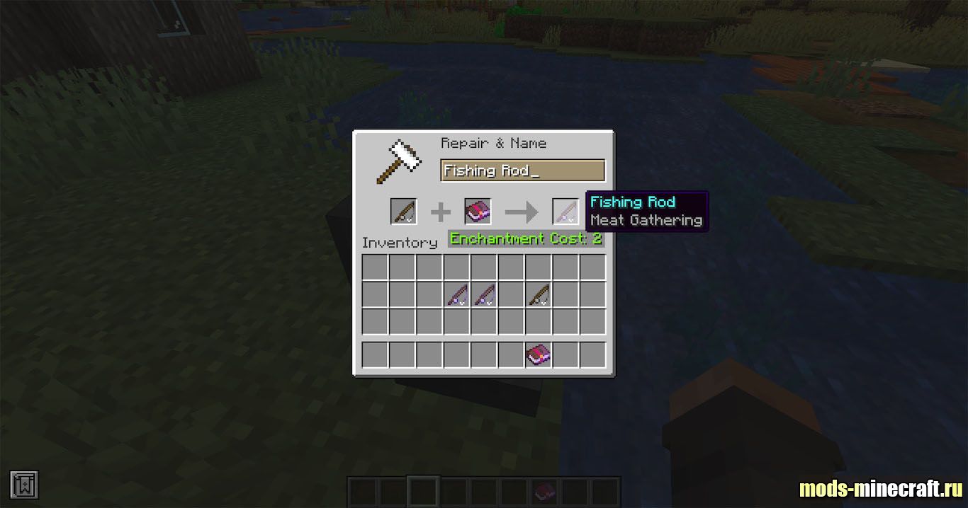 С модом Fishing Upgrades And More рыбалка перестает быть монотонной добычей еды и обрастает ролевыми механиками благодаря системе оценки трофеев и специальным чарам. На удочку теперь можно наложить один из четырех эффектов, поиск руды дает пятнадцатипроцентную вероятность вытянуть ценные материалы вместо обычного улова, а зачарование на дополнительную рыбу срабатывает ровно в половине случаев. Тем, кто любит делать запасы, подойдет сбор мяса, он приносит еду каждую четвертую попытку, рядом с ним существует и вариант на увеличение количества мусора, он кажется странным до тех пор, пока не начнешь использовать его в нужных крафтах и обменах.