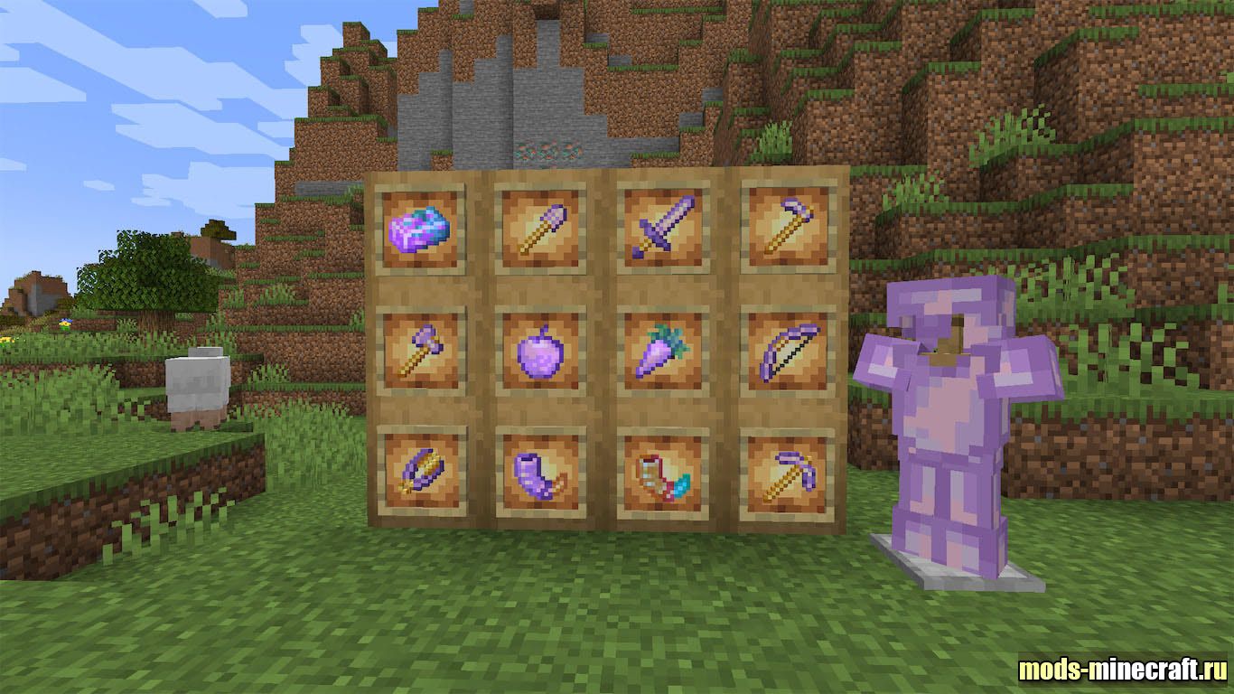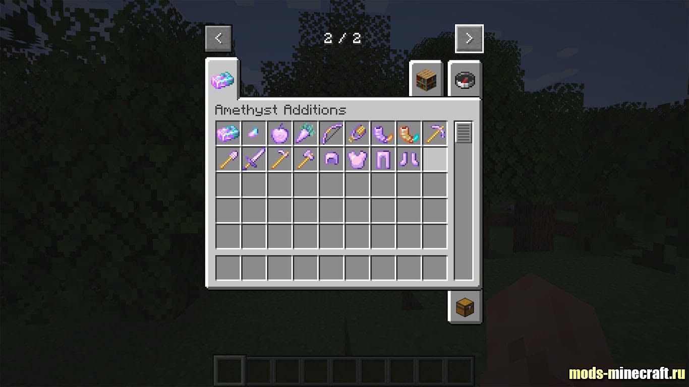 Обычно аметисты пылятся в сундуках без дела, но этот мод наконец находит им достойное применение в крафте полезного снаряжения, инструменты по эффективности не уступают алмазным, хоть и требуют более частого ремонта, а броня занимает уверенную позицию между железом и алмазом, и когда доходишь до полного комплекта доспехов, появляется ночное зрение, которое снимает привычную возню с факелами в глубоких пещерах и заметно облегчает выживание и добычу ресурсов.