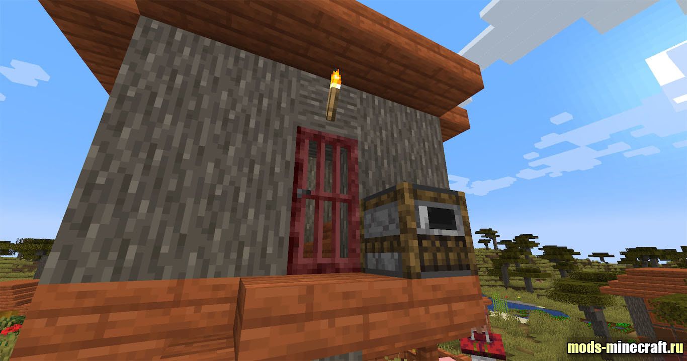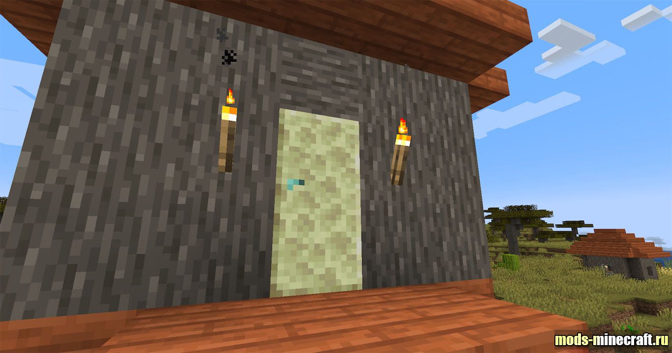 Стандартные деревянные варианты часто ограничивают, когда хочется построить надежное хранилище или индустриальный цех. Именно поэтому модификация расширяет инвентарь более чем полусотней новых дверей и люков, которые наконец-то соответствуют окружающим блокам. Так сокровищницу можно закрыть тяжелой алмазной или изумрудной дверью, а вход в реакторную защитить медью и незеритом. К этой же логике подстраиваются и менее статусные материалы, уголь и редстоун получают структурное применение, позволяя делать тематические проходы, которые сливаются со стенами шахты или склада.