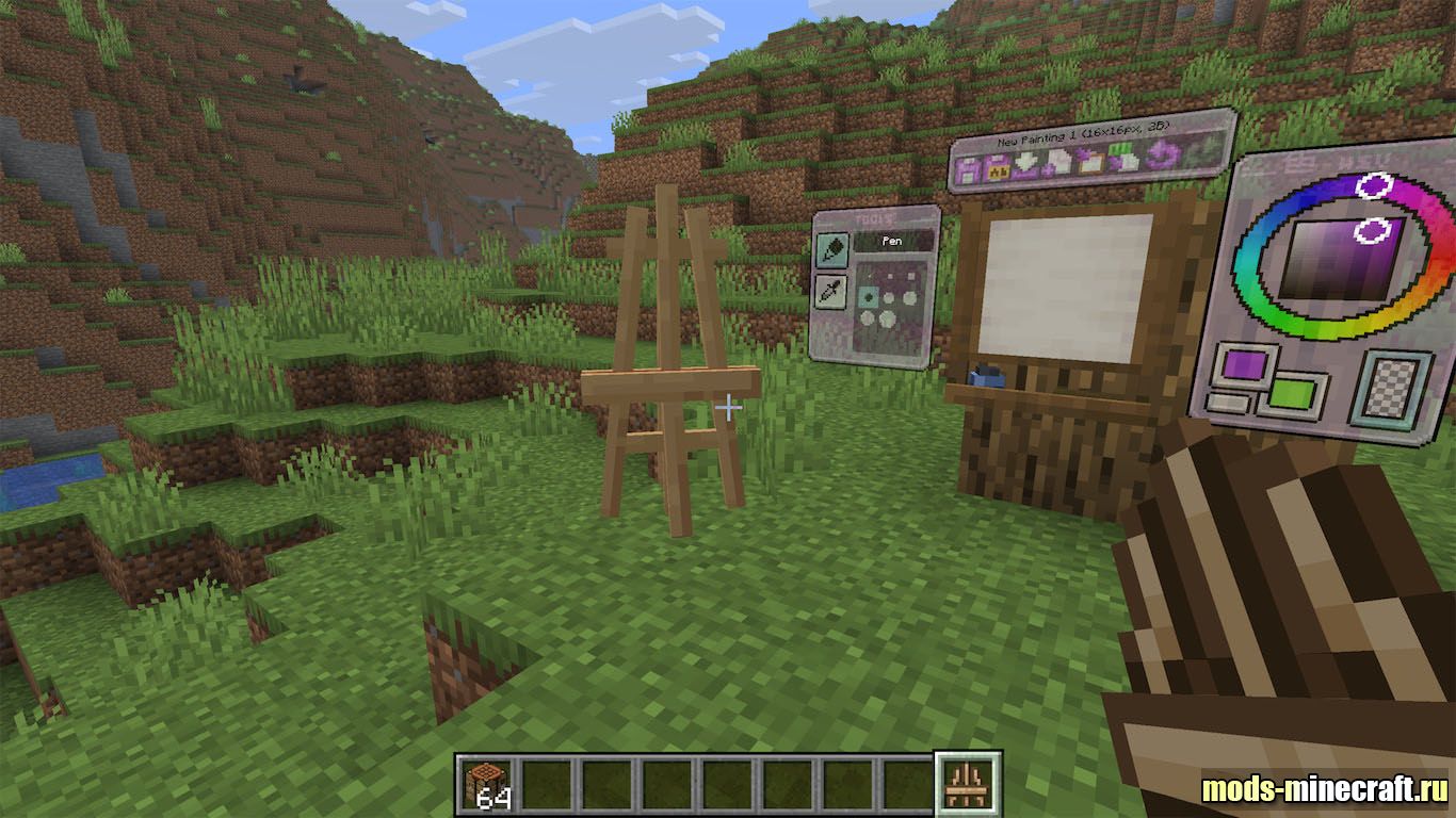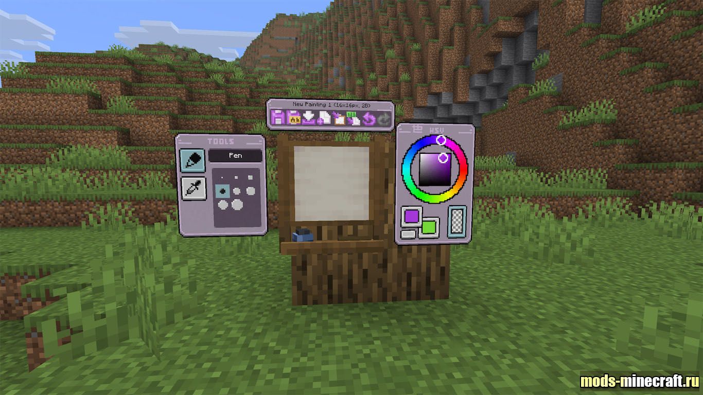 Эту картину можно ставить не только на стену, но и на пол или потолок, что удобно для витрин и небольших экспозиций. Для покраски помогают вёдра с заранее набранной краской, когда нужен один и тот же цвет много раз. Мольберт позволяет поставить работу на стойку без крепления, он реагирует на падение, воду и движение вагонеток. После установки картину можно крутить компасом и менять прозрачность через лёд. Чтобы обнулить рисунок, достаточно отмыть её в котле с водой, и она снова станет обычной ванильной картиной. Готовые работы можно выгружать строкой Base64, чтобы переносить на другой мир или сервер, делиться ими без привязки к одному сохранению.