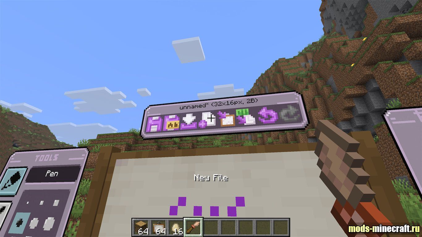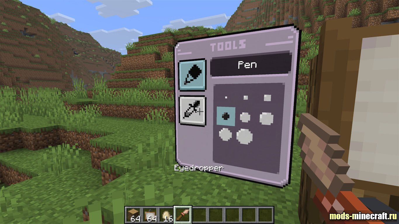 Eroxen MC Paint добавляет в Minecraft способ рисовать свои картины прямо в мире и сразу ставить их как обычный декор. Всё начинается со студии, бросаешь яйцо в ванильную картину и появляется окно с холстом и инструментами. Там рисуешь по пикселям, выбираешь цвет пипеткой, кладёшь точки кистью, стираешь ластиком, потом сохраняешь результат в отдельную пользовательскую картину.