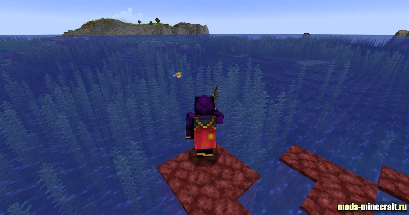 XPlus Autofish берёт на себя всю рутину с удочкой. Закидываешь один раз, дальше мод сам подсекает и перебрасывает через пару секунд. Если удочка вот-вот сломается, он её пропустит и переключится на следующую в хотбаре, так что зачарованный инструмент не сгорит впустую. На лагающих серверах есть режим, который перебрасывает леску каждые десять секунд, даже если что-то пошло не так. В мультиплеере ловля определяется по звуку, а не по движению поплавка, и это заметно стабильнее работает с другими модами.