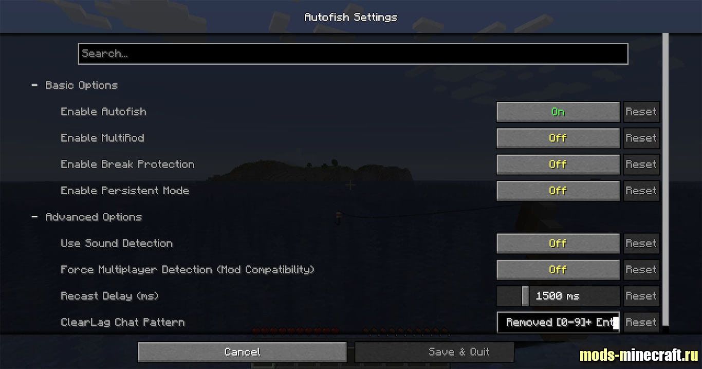 Из мелочей, которые реально пригождаются, тут есть детект серверных сообщений о чистке сущностей, после которого мод сам закидывает удочку заново. Можно настроить задержку между подсечкой и забросом, добавить случайный разброс по времени. Есть проверка на открытую воду, чтобы не терять шанс на редкий лут. Всё это настраивается прямо в игре, по умолчанию экран конфигурации открывается на клавишу V.