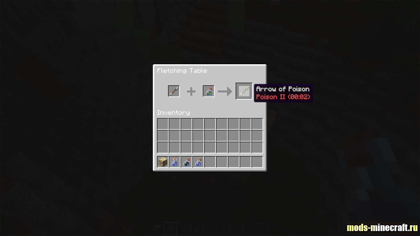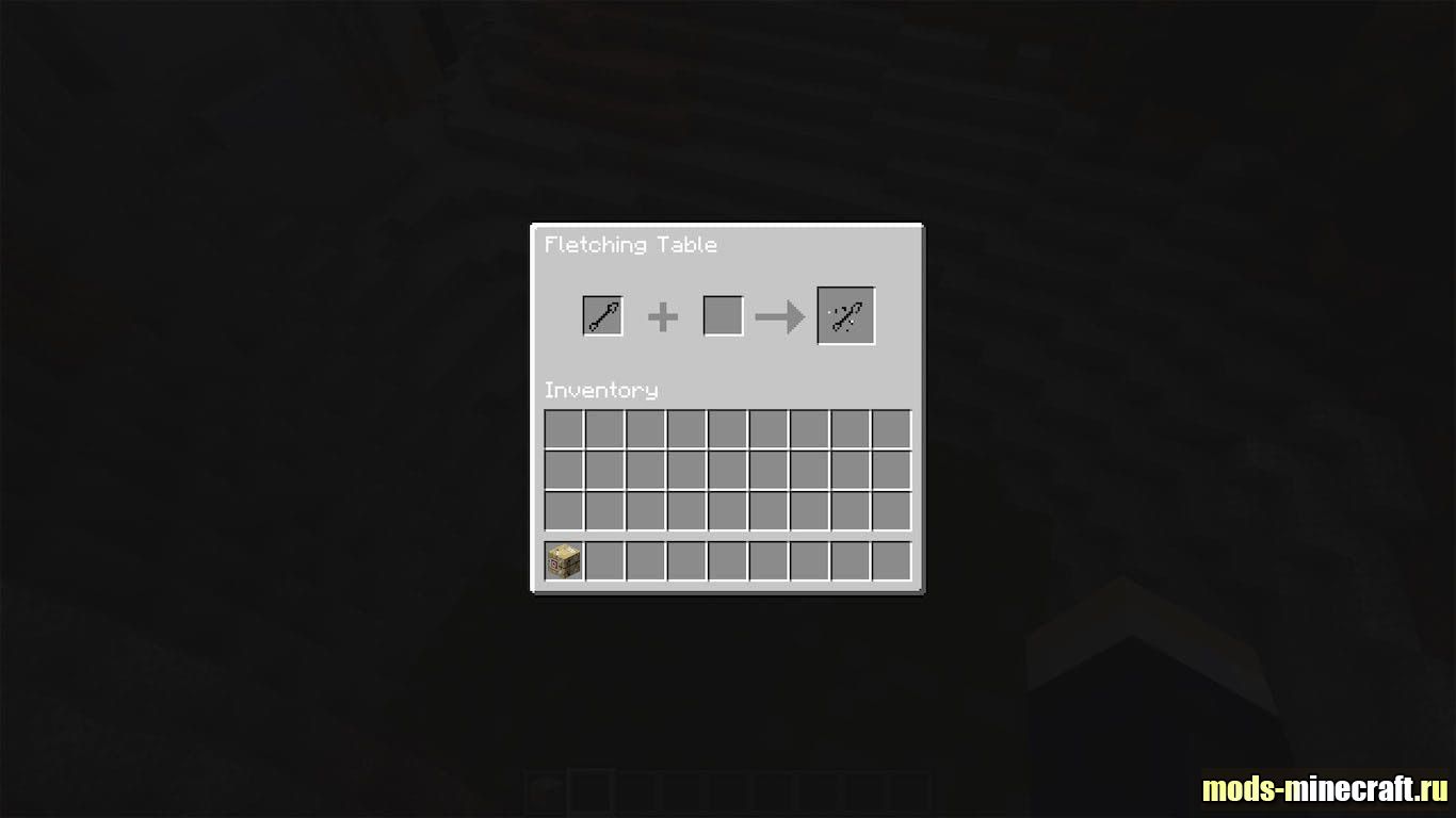 В ванильном Minecraft стол лучника просто стоит без дела, и это всегда немного раздражало. Мод Fletching Table наконец даёт ему работу. Кладёшь обычные стрелы в первый слот, добавляешь туда же затяжное зелье, и на выходе получаешь стрелы с эффектом. Одно зелье конвертирует сразу всю стопку из первого слота, что заметно экономит ресурсы.