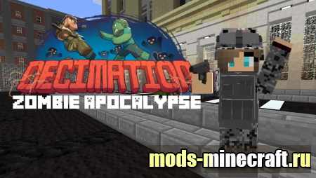 Decimation Overgrown Realistic Zombie Apocalypse самый лучший мод Майнкрафт зомби Апокалипсис, огромный выбор оружия, в арсенале: снайперские винтовки, дробовики, несколько видов автоматов и пистолетов, полностью настраиваемый модуль прицелов, обвеса на