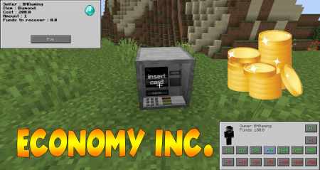 В моде на экономику Economy Inc. реалистичная игровая валюта, добавлены кредитные карты, счет в банке, обменники и доллары для создания простой и безопасной экономики в Майнкрафт. Все банкоматы и торговые автоматы, для обмена ресурсов на деньги, имеют