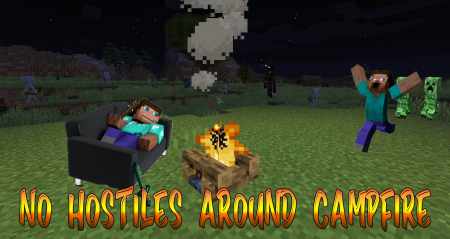 Мод No Hostiles Around Campfire включает защиту от враждебных мобов рядом с костром. Мобы не будут подходить и спавнится около костра. Радиус можно настроить в конфигурации мода (preventHostilesRadius), а все классифицированные мобы как