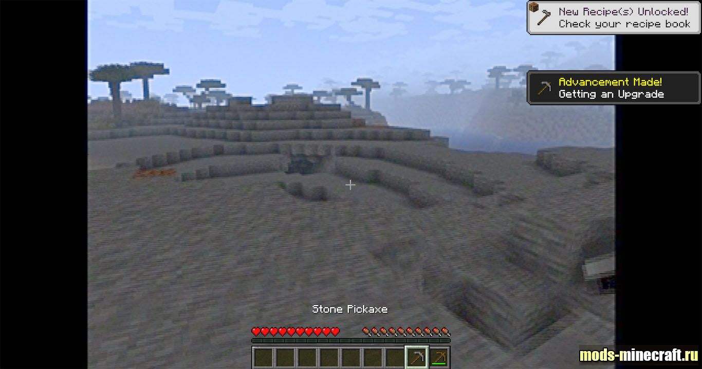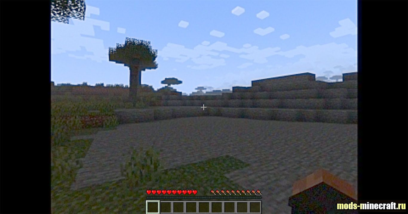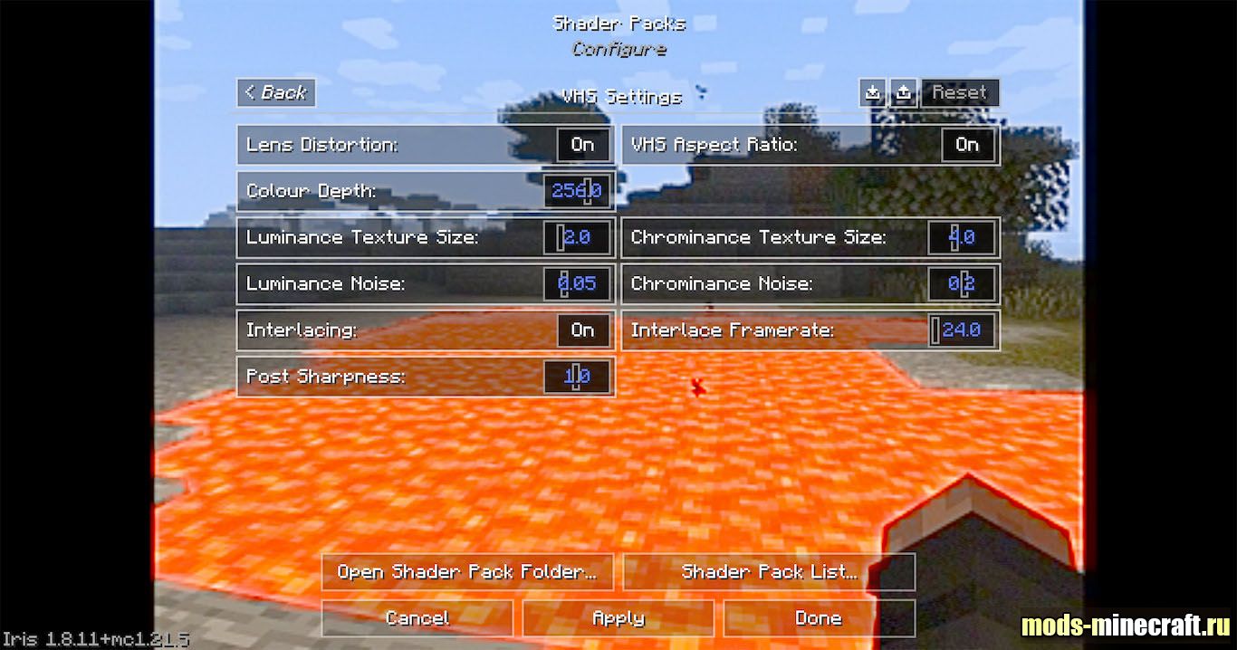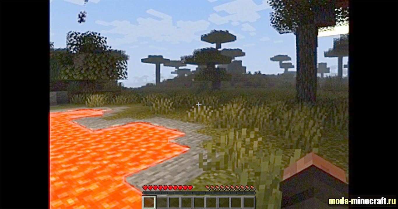 MC VHS шейдер полностью меняет восприятие игры, имитируя дефекты старой видеопленки. Вместо простого наложения сетки здесь используется мягкое размытие и характерное дрожание картинки. Цвета заметно смещаются, а края блоков слегка двоятся, создавая эффект затертой кассеты. Эти визуальные искажения придают кубическому миру непривычную глубину, делая освещение более вязким.