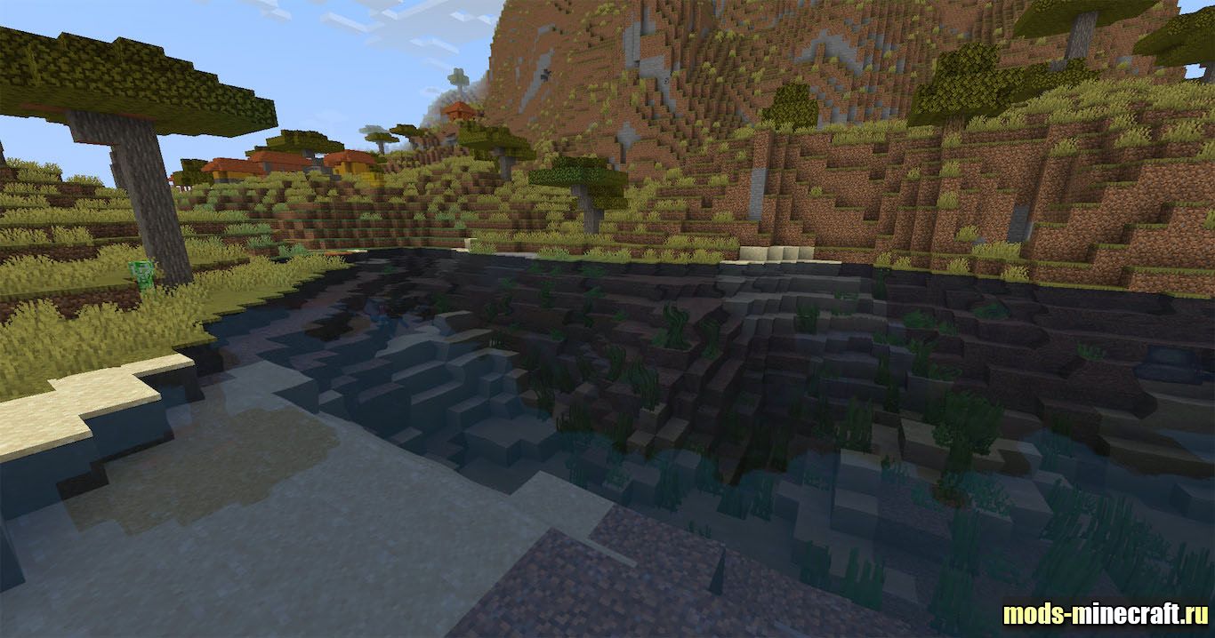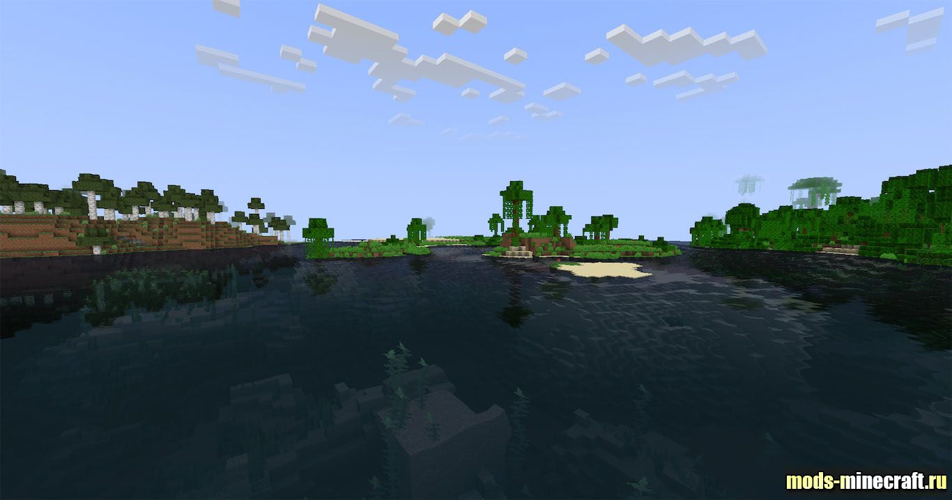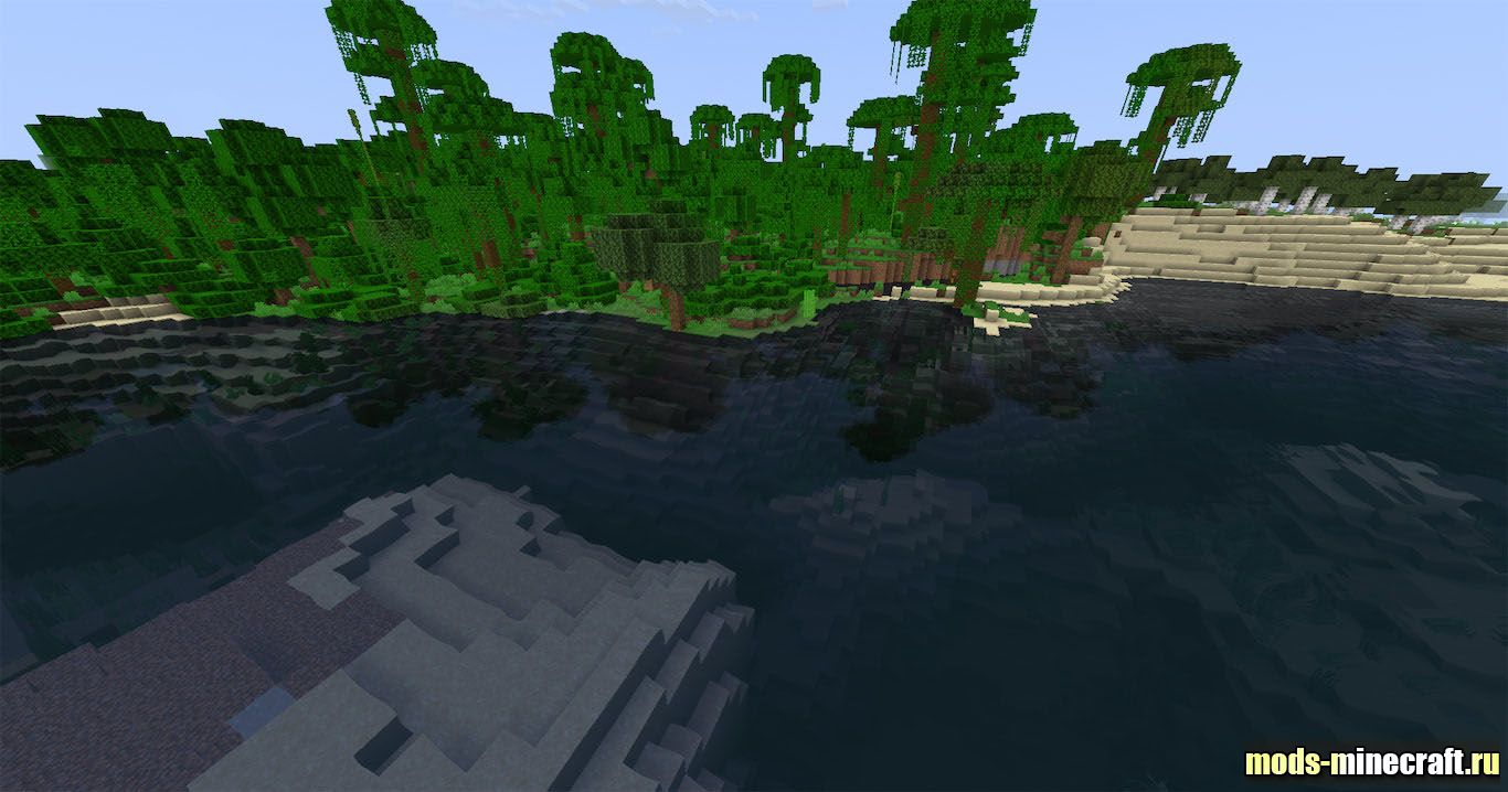 Water Shaders меняют воду в Minecraft, она начинает вести себя как настоящая. Появляются отражения на поверхности, видно, как картинка искажается под водой, и как свет ломается на границе. В спокойных местах заметна глубина и прозрачность, у берега проще различить дно, камни и водоросли. Это движение воды не позволяет ей оставаться ровным пятном.