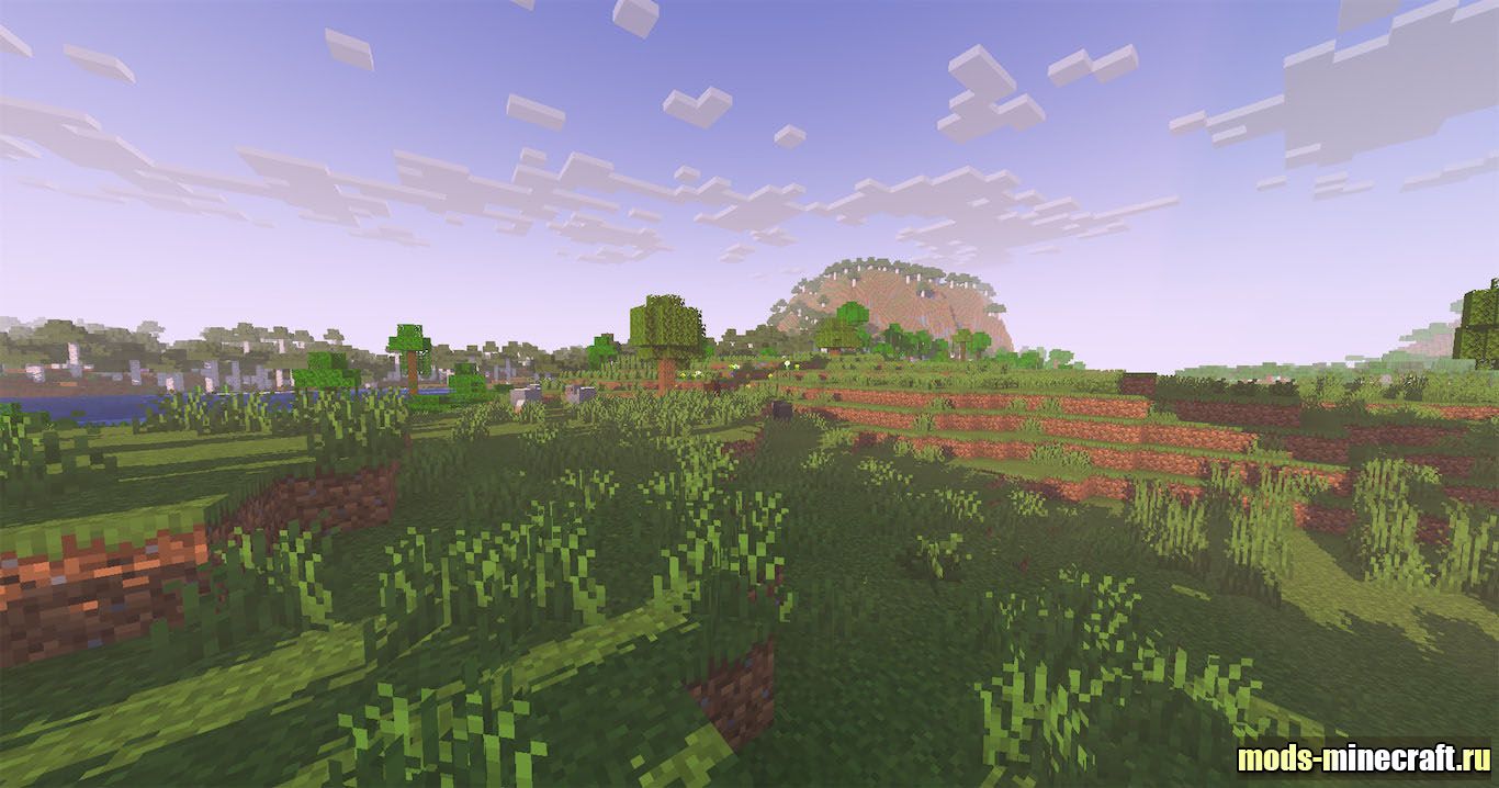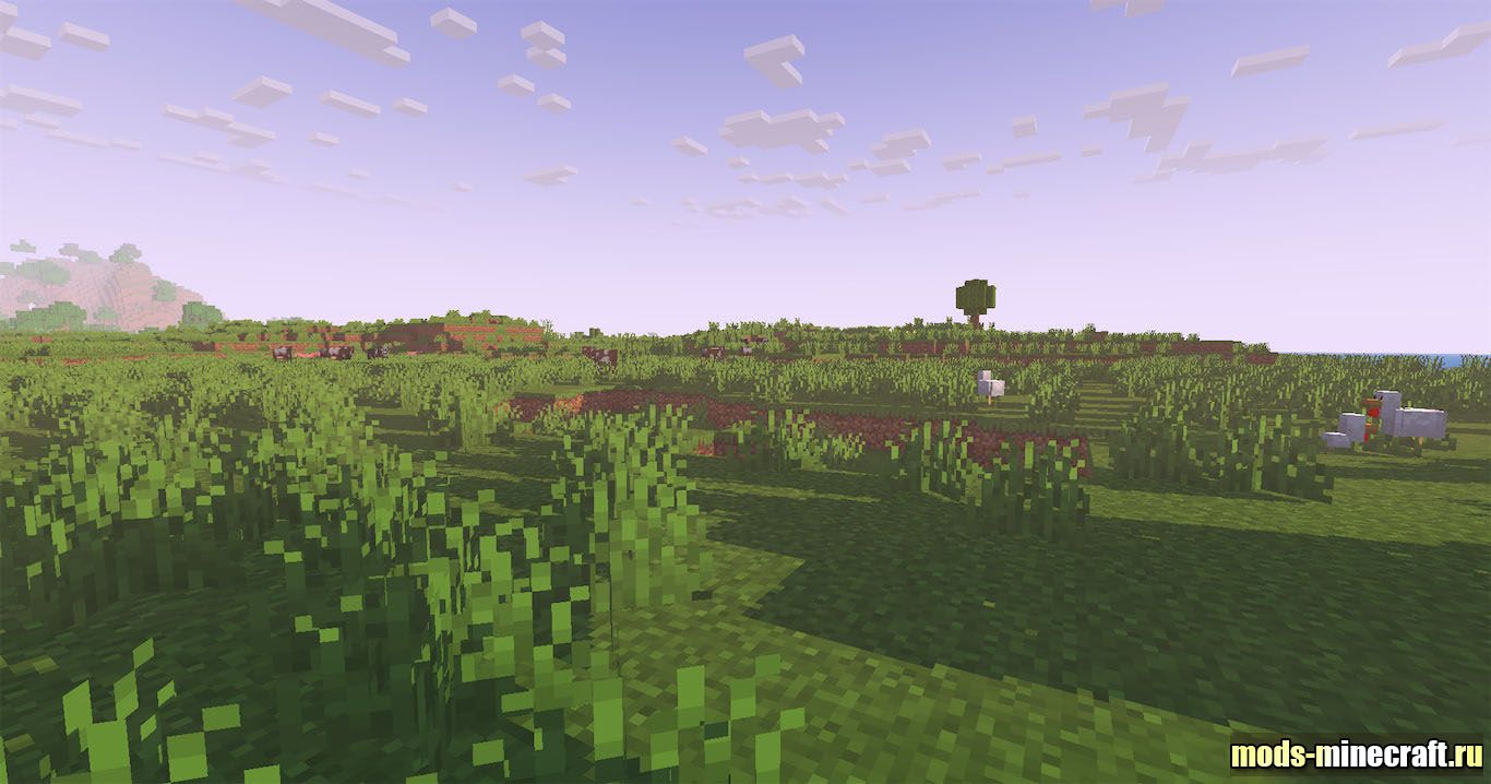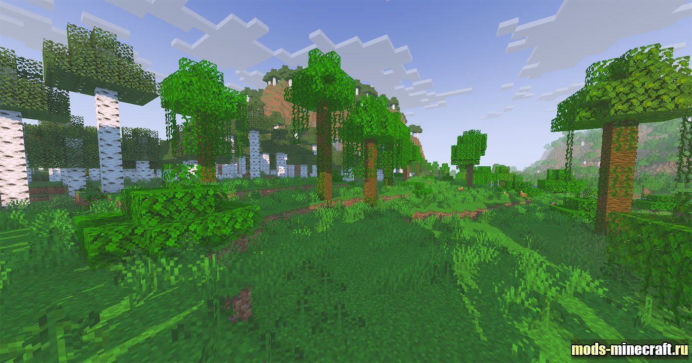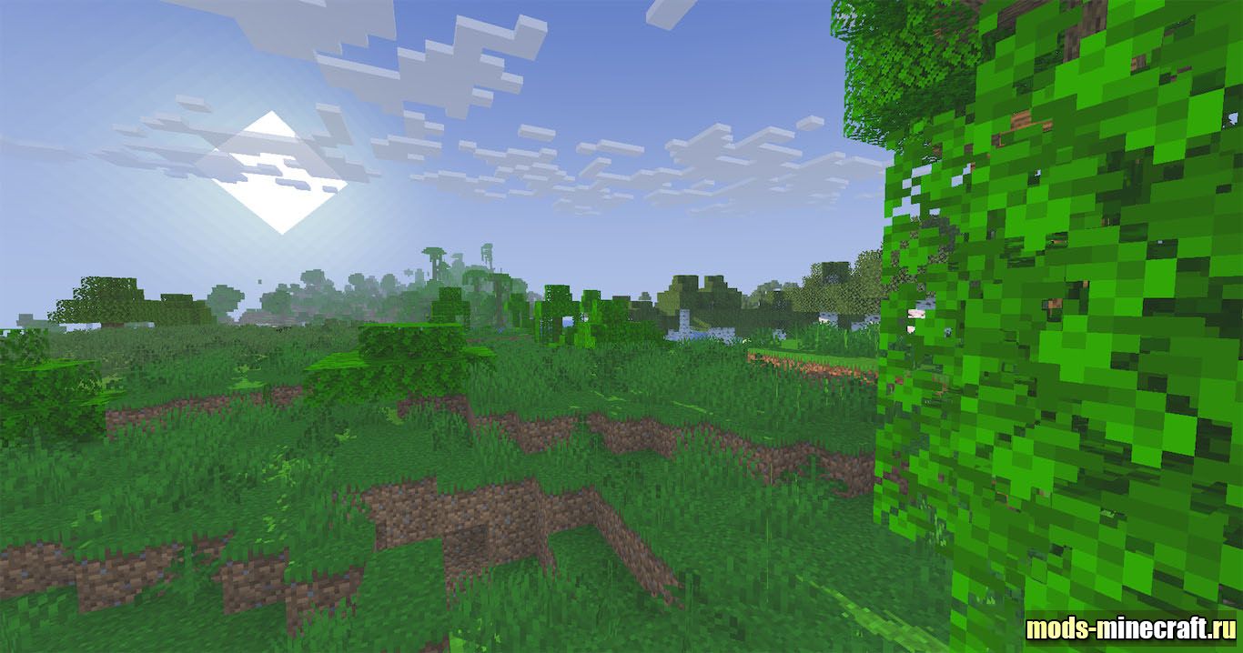 Radiance добавляет объёмные лучи света, которые видны в воздухе и в воде. Из за них фонари в шахте и солнце в лесу читаются сразу, а тени остаются пиксельными, с ровными ступенями по краям. Это не даёт картинке уйти в гладкий реализм, блоки выглядят привычно.