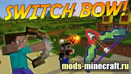Switch Bow добавляет улучшенный лук, колчан и 20 новых уникальных стрел с молнией, TNT, снежную, телепортирующую стрелу, с отравлением, с факелом, огнем, фейерверком, водную, огненную и стрелы с различными эффектами зелий. Прокручивая колесиком можно