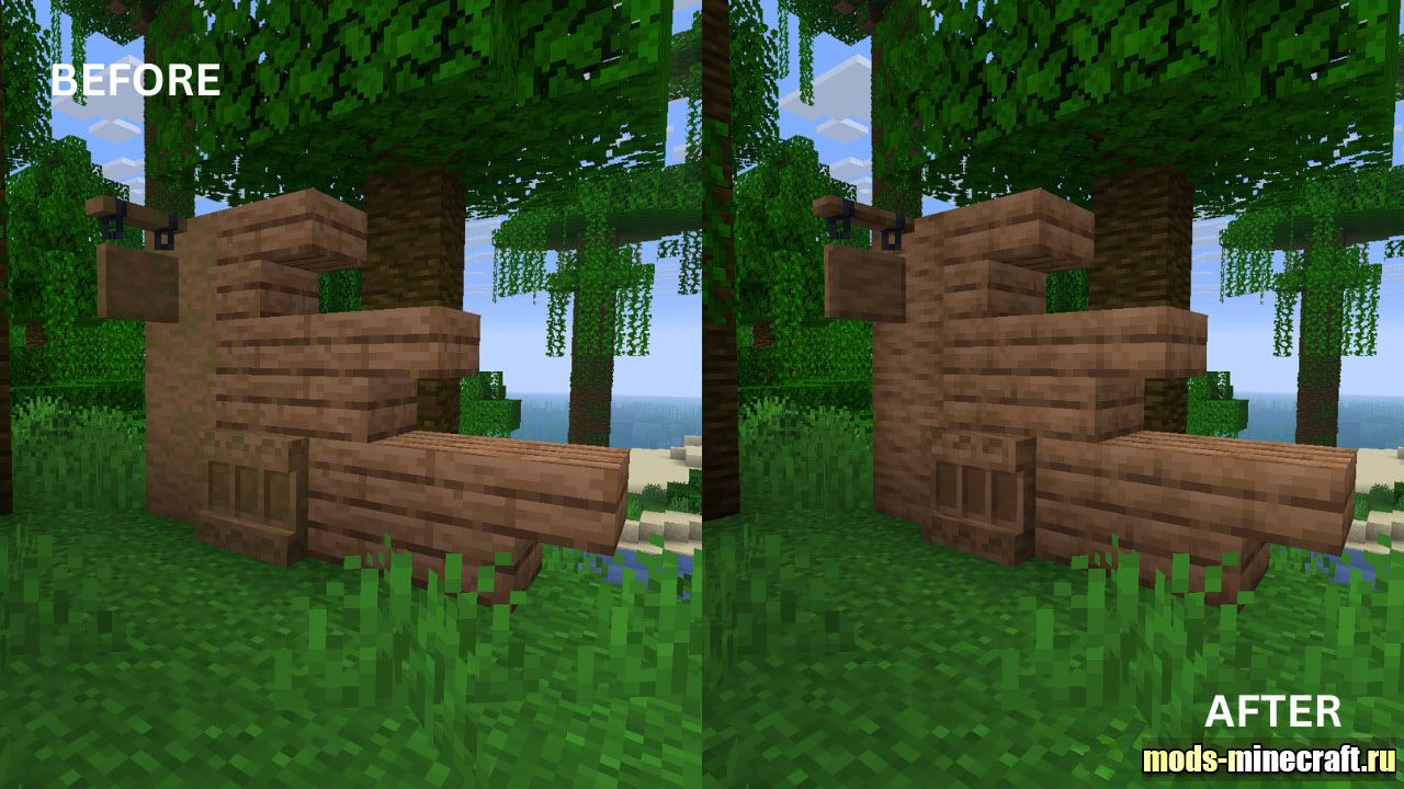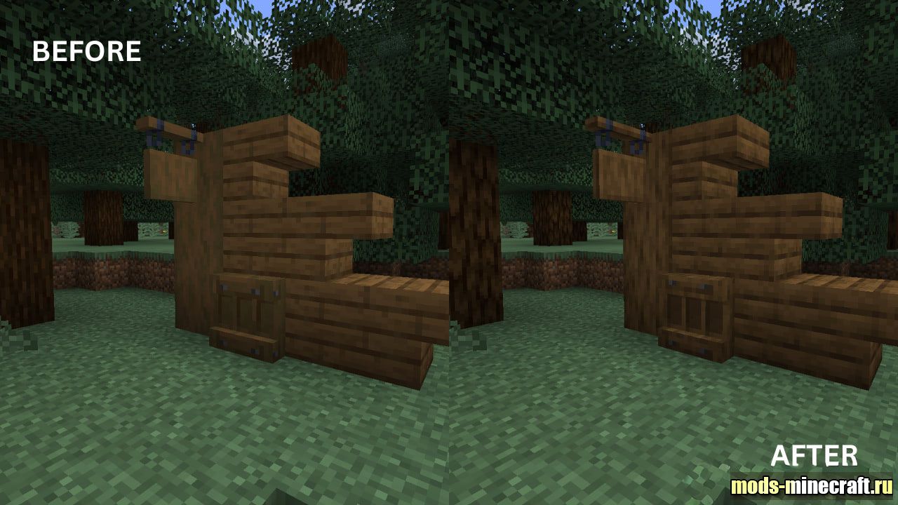 Choppy Wood переосмысляет внешний вид привычных деревянных блоков, сглаживая текстуры бревен, досок и книжных полок. Теперь материалы смотрятся более целостно и органично, исчезает визуальный шум при стыковке разных элементов, будь то лодки или подвесные таблички. В процессе стройки сразу замечаешь, как фасады зданий и интерьеры становятся чище, сохраняя при этом узнаваемый ванильный стиль.