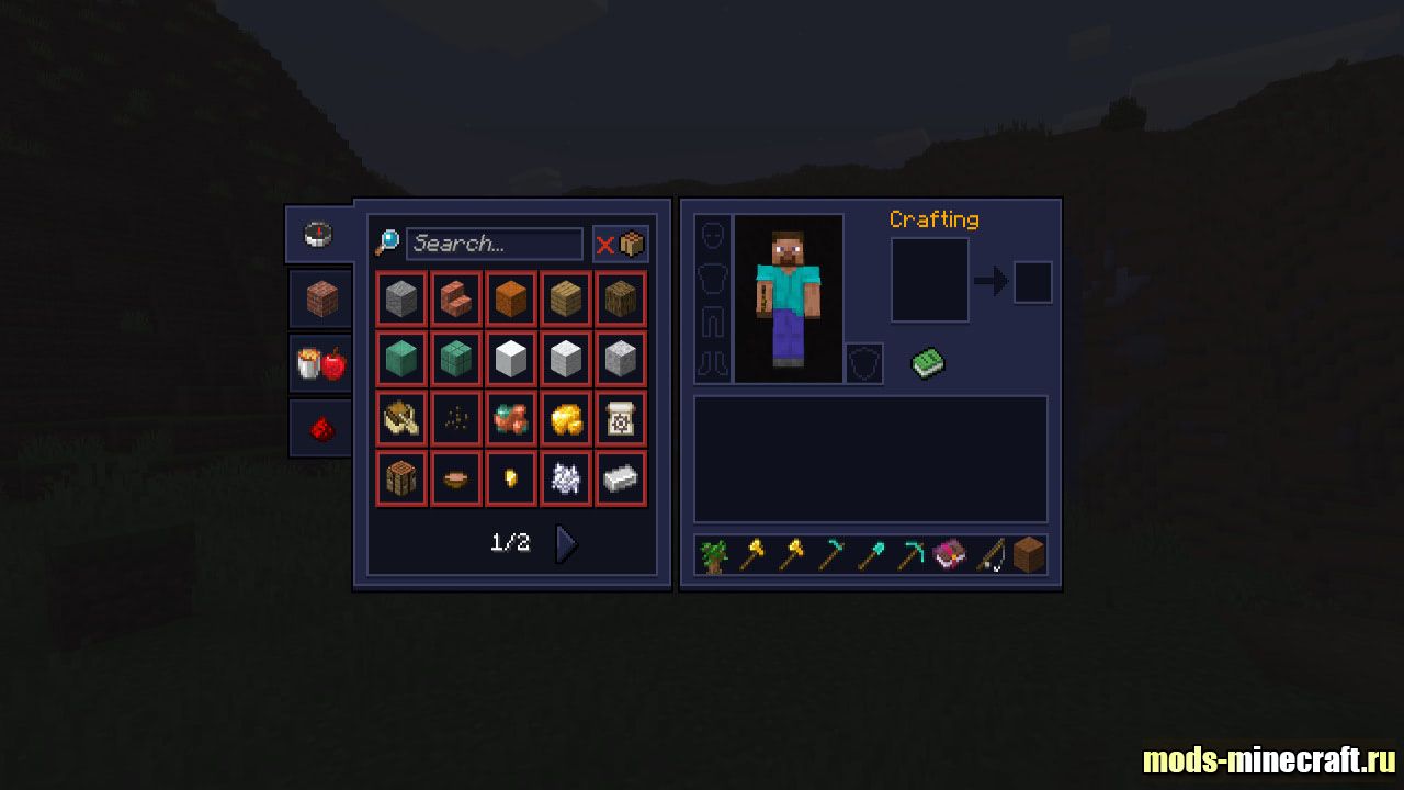 GUI NightStylized меняет только интерфейс Minecraft, без затрагивания механик. Меню и инвентарь становятся темнее, как в тёмном режиме, с ровными квадратными краями и гладкими панелями. Кнопки и мелкие элементы выглядят аккуратнее и собраннее, чем в ваниле, текст и рамки читаются проще на фоне ночных сцен и тёмных биомов.